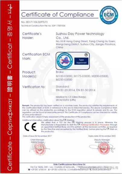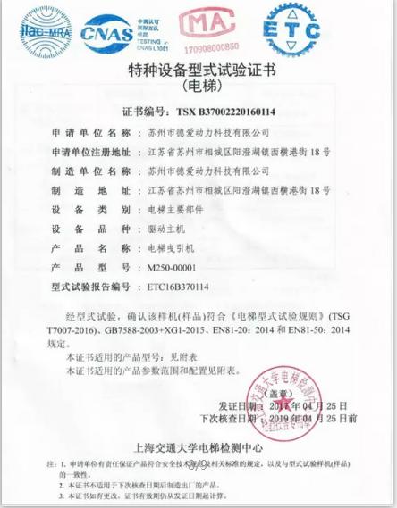 德愛動力碟工馬達產品的問世,直接打破歐美跨國公司多年的技術壟斷,填補了國內碟式馬達的技術空白。產品可廣泛應用于無機房電梯驅動、工程機械驅動等“低轉速、大扭矩”且有節(jié)能環(huán)保要求的場合。德愛動力碟式馬達由上海交通大學電梯檢測中心驗證合格,且目前已經通過CE認證!